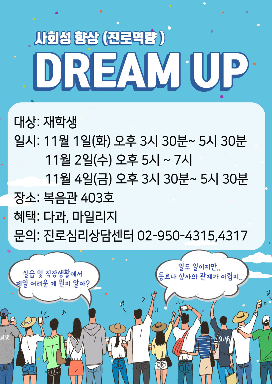 참여대상: 실습 나가봤더니 일보다 상사와 동료들과의 관계가 어려우신 분들(자꾸 상사의 눈치를 보게되고, 동료들이랑 무슨 이야기를 해야할지 모르겠는 분들, 실수했는데 멘붕와서 머리가 하얗게 되시는 분들), 실습을 나가서 사람들과 어떻게 관계를 맺어야 할지 모르겠는 분들, 취업 후에 내가 사람들이랑 관계를 잘 맺을 수 있을지 걱정되는 분들, 현재 아르바이트 및 근로를 하는데 사람관계가 어려우신 분들 모~두 여기로 모여주세요~