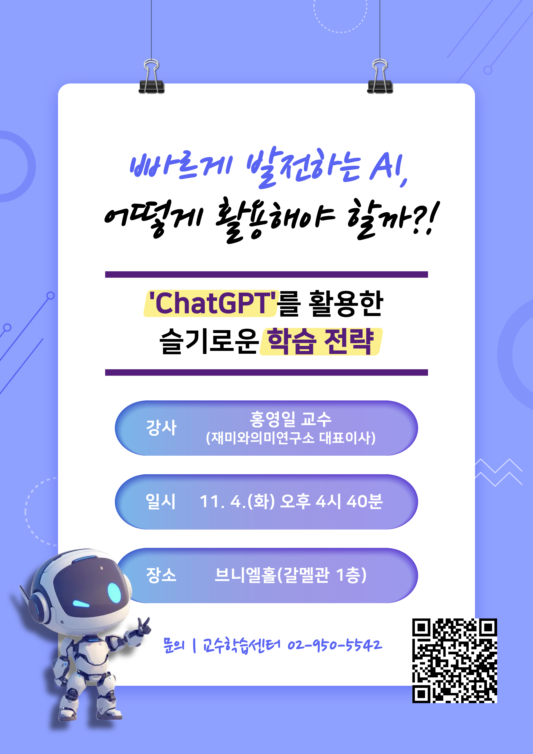 [교수학습센터] 'ChatGPT'를 활용한 슬기로운 학습 전략 워크숍 안내(11/4)